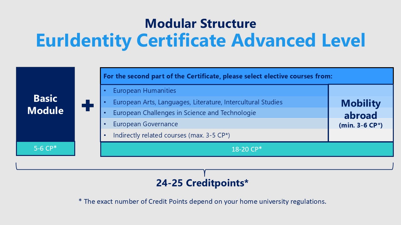 Die Studierenden absolvieren insgesamt 24 ECTS (25 ECTS an der Universität Trier). Die Belegung des EurIdentity Basic Moduls „Foundations of Europe“ und eine Auslandsmobilität sind dabei verpflichtend.
