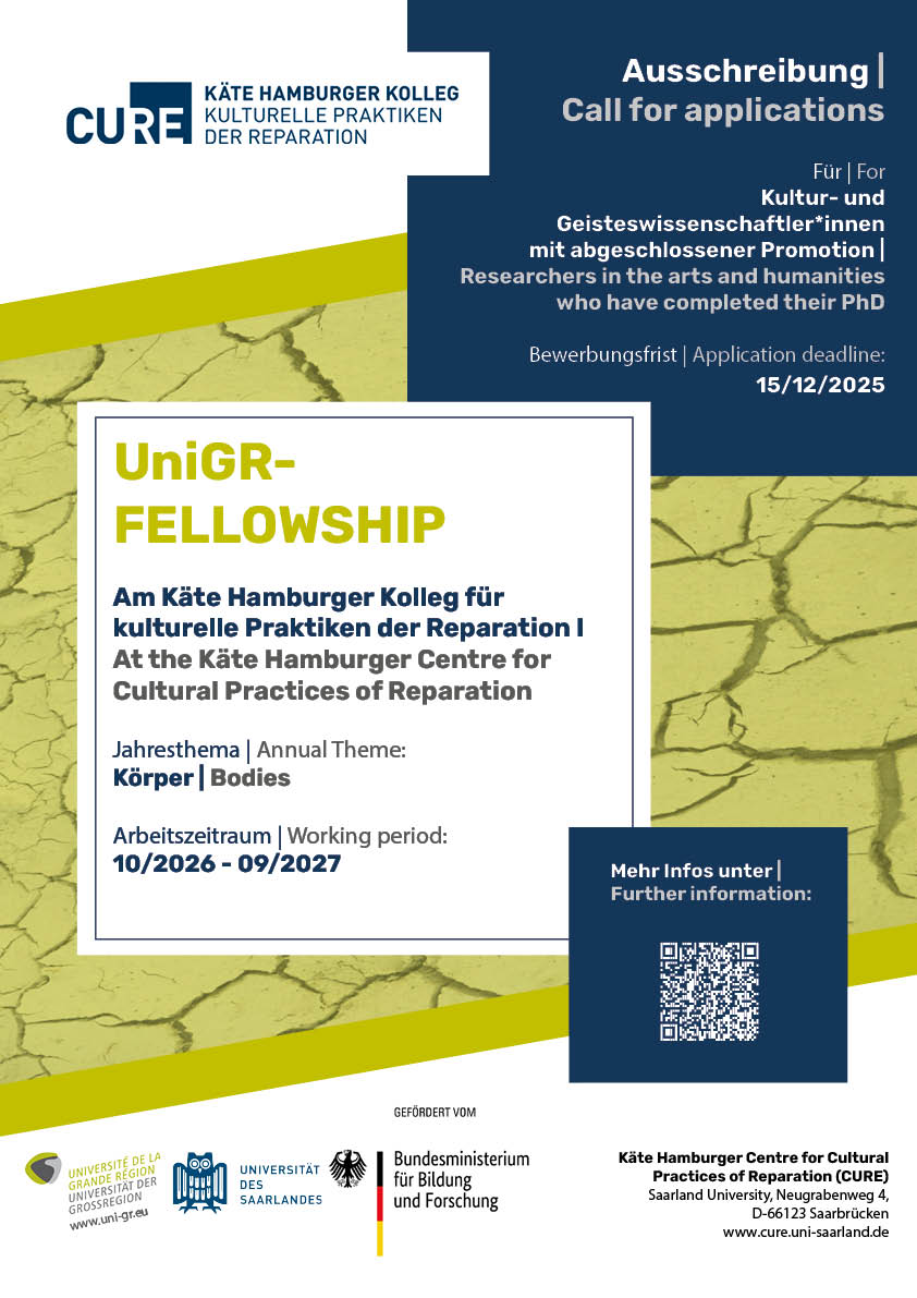 The Käte Hamburger Center for Cultural Practices of Reparation (KHK CURE) at Saarland University is an institute for advanced study, funded by the German Ministry for Research, Technology and Space (BMFTR) since 2024. Each academic year, a new group of international and interdisciplinary fellows joins the centre to pursue research. For the centre’s third year (October 2026 to September 2027), we are pleased to invite applications for up to twelve fellowships with a duration of ten to twelve months (beginning in October 2026).