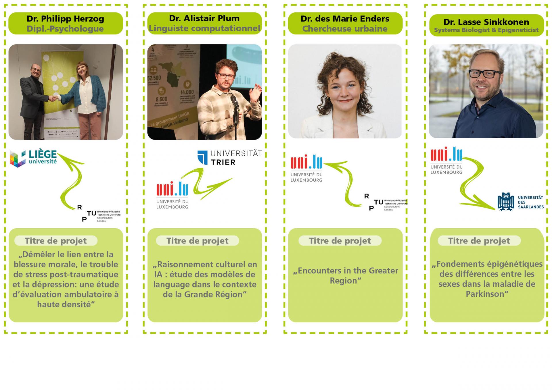 Cette initiative vise à soutenir la mobilité à court terme de professeur.e.s (juniors) et de chercheur.e.s post-doctoraux.ales pour une durée de 2 mois entre les sept universités partenaires de l'UniGR. Cette mobilité vise à favoriser la coopération interdisciplinaire et l’établissement d’un standard de qualité commun entre les universités. Elle sert de catalyseur essentiel pour aider les chercheur.e.s à réaliser des études comparatives approfondies au sein de la Grande Région.